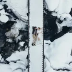Nous voilà transformés en explorateurs. Partis à la recherche du LIEU des photos des amoureux du jour, nous sommes motivés comme jamais ! Ce que nous découvrons est au-delà de nos espérances ! Ainsi, le ruisseau, avec ses rochers enneigés et givrés offre un cadre romantique à souhait pour les photos de couple de Juliette. Quant à Baptiste, il s’éclate à diriger son drone à travers les courbes de la rivières et les sapins enneigés.