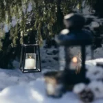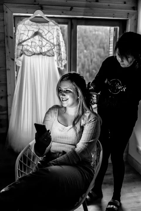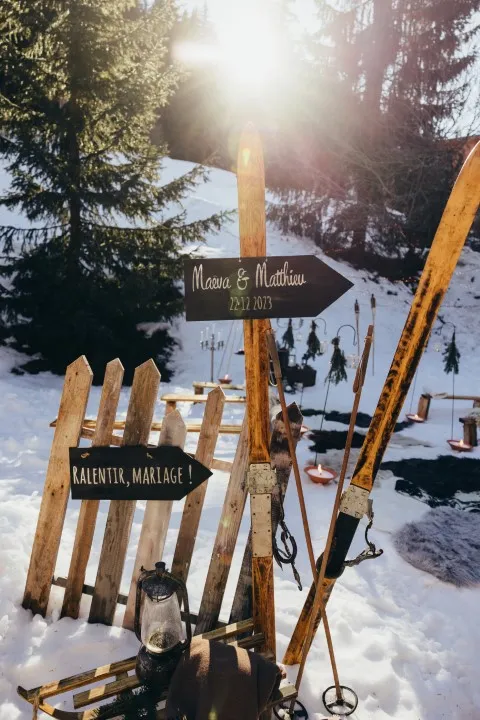 Huit heures de route plus tard, voiture vidée, il est temps de se mettre à la recherche des endroits stratégiques ! Le lieu de la cérémonie est vite déterminé. Le jardin du chalet offre un cadre idéal : sapins à illuminer, neige à volonté, table pour le buffet du vin d’honneur. Le coin repas, lui, se situera devant le poêle à bois, effet cocooning garanti ! C’est devant la fenêtre du salon que se feront les photos des préparatifs de la mariée ! En effet, les montagnes enneigées offriront un visuel de fond parfait !