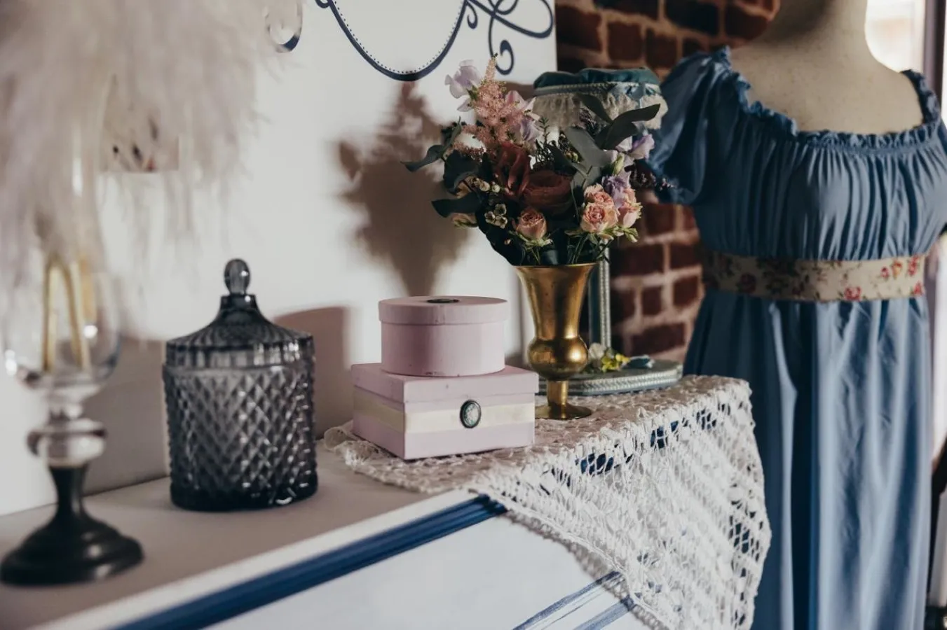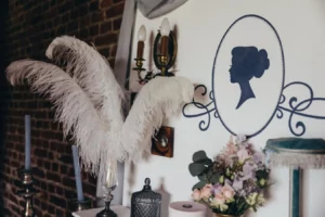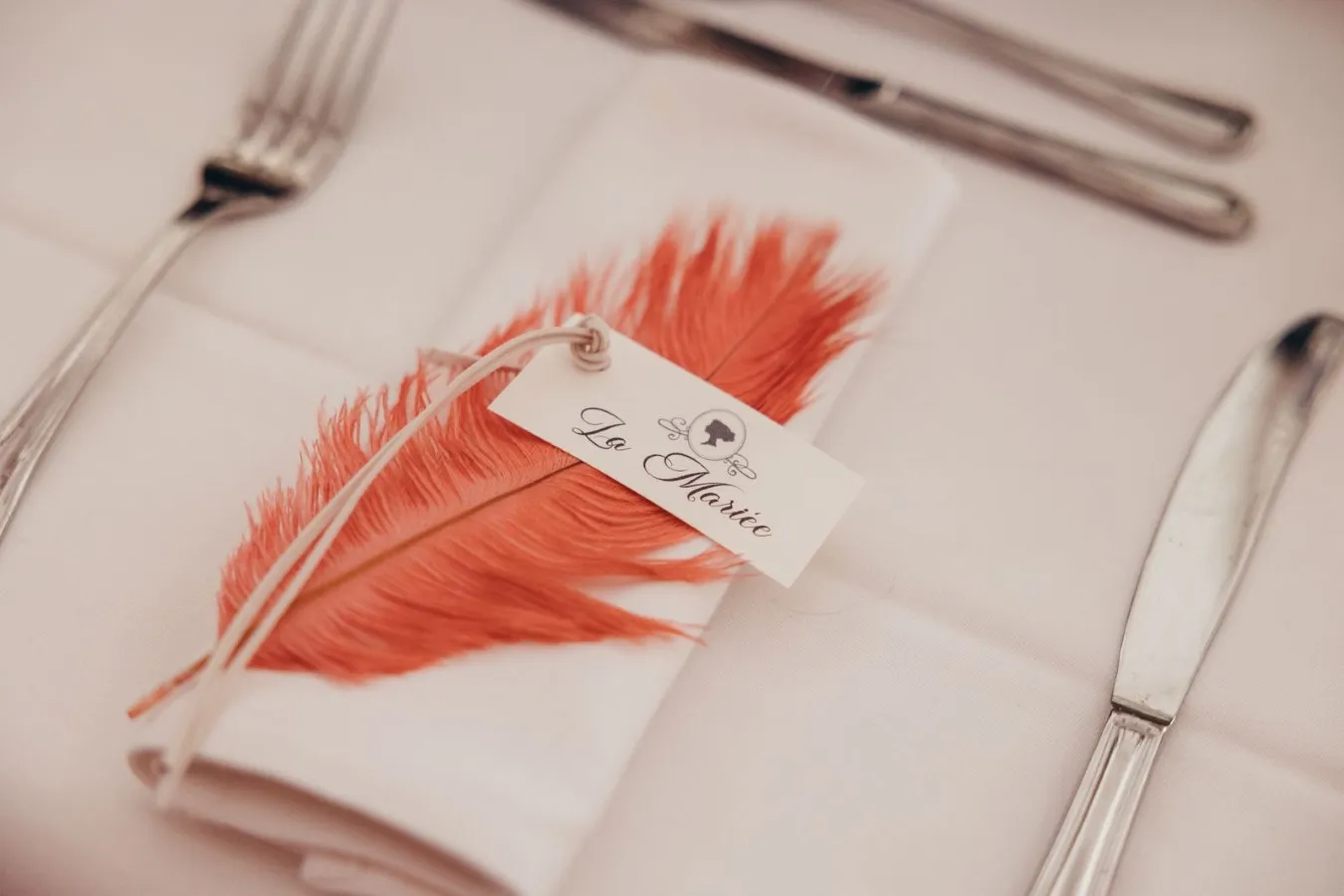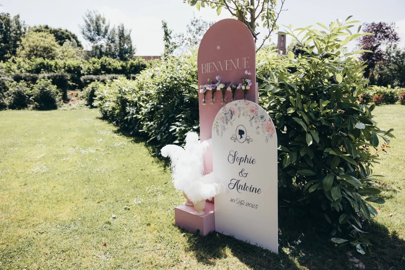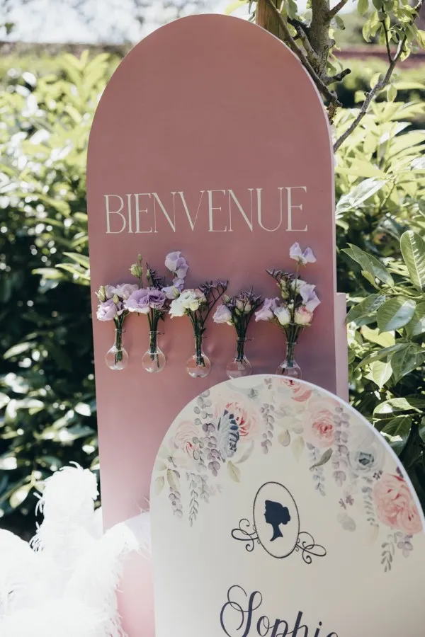 Des plumes ! Elément indispensable pour Sophie, la plume d’autruche ! La fée en a mis partout ! Les porte-noms délicatement posés sur les serviettes et composés d’une plume vieux rose ont placé les invités. Le panneau de bienvenue, reproduction en peinture du faire-part n’y a pas échappé non plus ! En effet, la fée l’a également orné de compositions à base de plumes. Les invités ont eux aussi retrouvé cet élément dans le coin photos. Ce dernier représente la boutique de la modiste ! C’est le plus important clin d’oeil à la série.