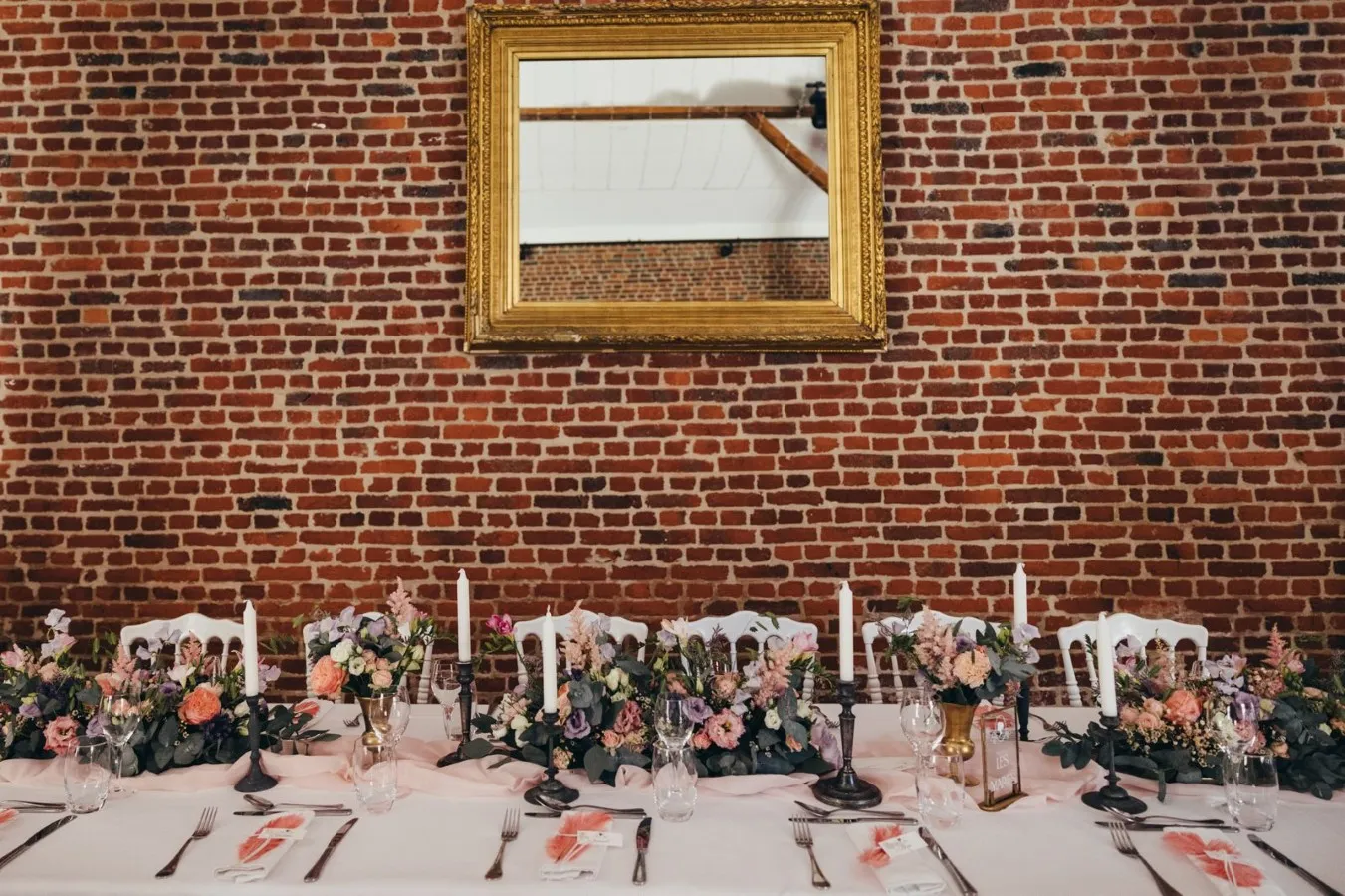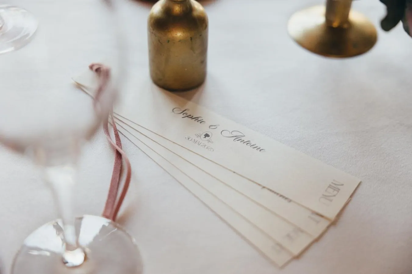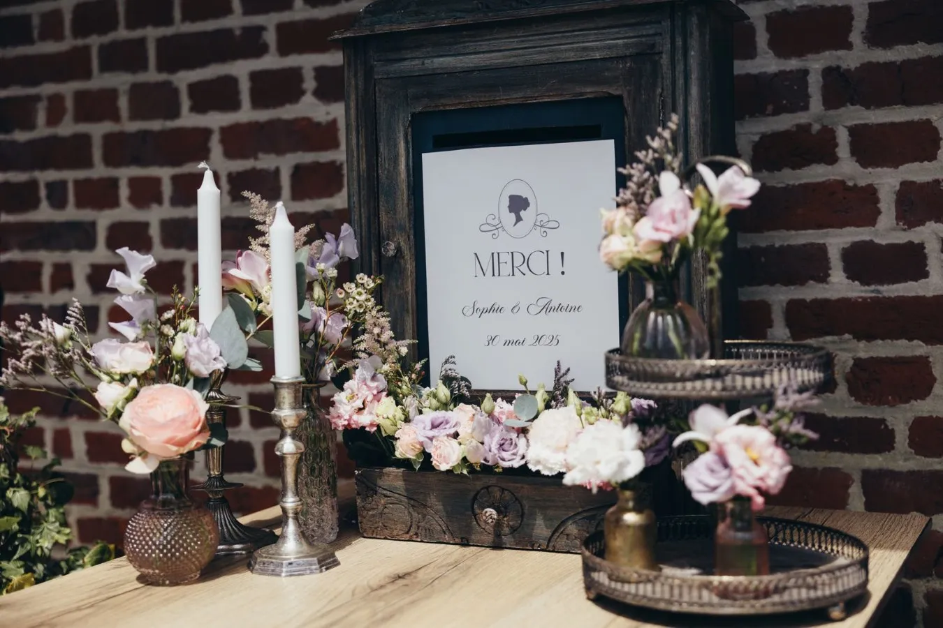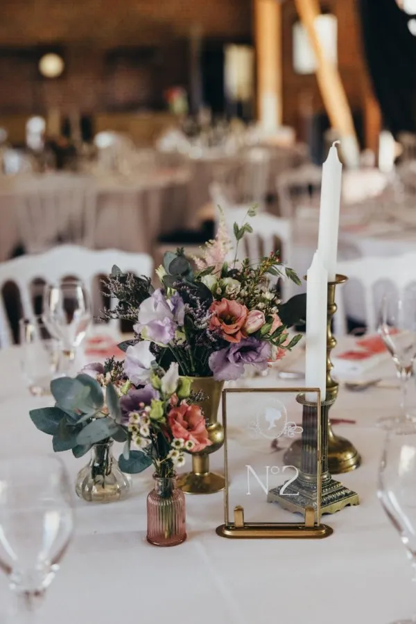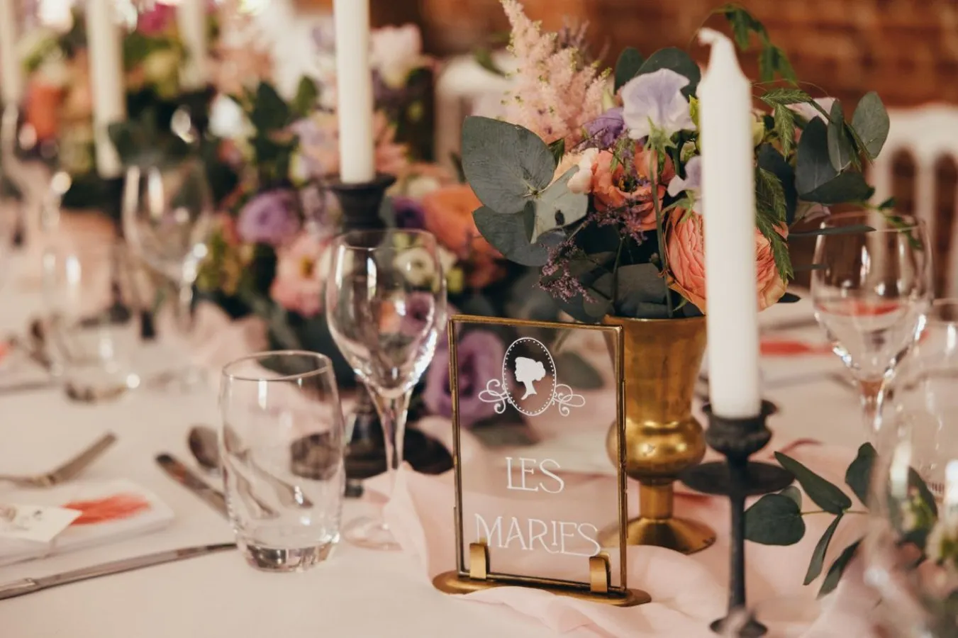 Cependant, Sophie ne voulait pas pour autant tomber dans le cliché, convaincue que ses invités ne connaissaient pas la série, ou très peu. Les centres de table sont restés relativement sobres, jolies coupes dorées fleuries. Ensuite, les bougeoirs dépareillés ont apporté la touche vintage, chic et chaleureuse. Enfin, la fée a développé un peu plus le thème en accentuant la déco du plan de table et du coin photos.
