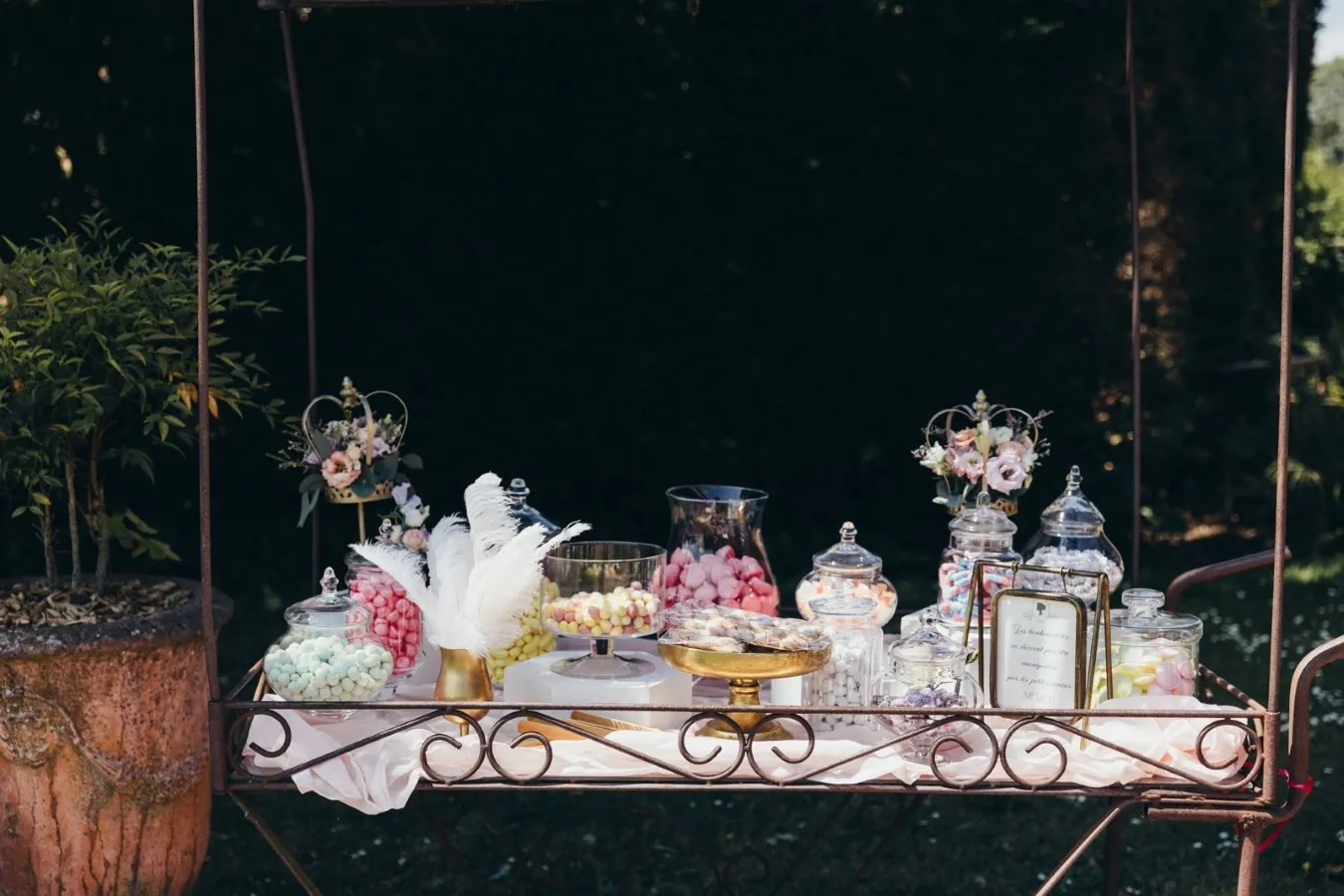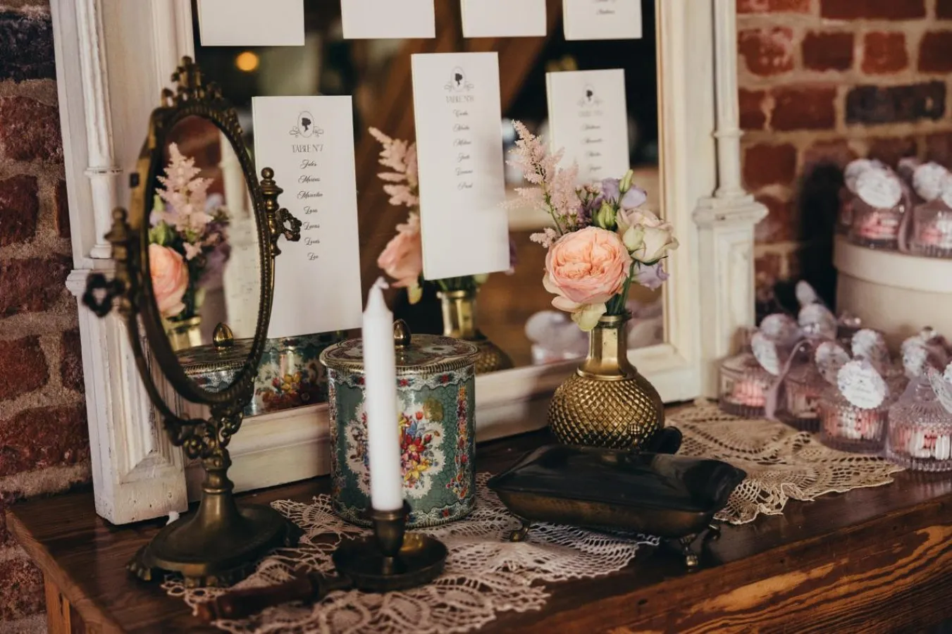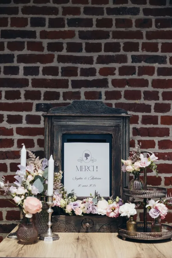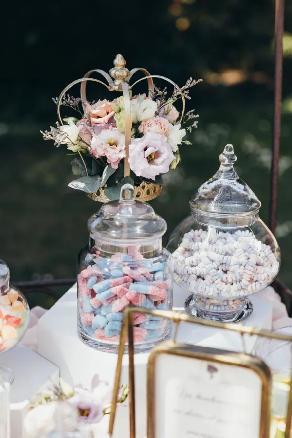 Votre décoratrice a aussi travaillé le thème sur la tirelire et le candy bar. Ainsi, cette multitude de détails a plongé les invités dans l’univers d’un mariage Bridgerton romantique à souhait !