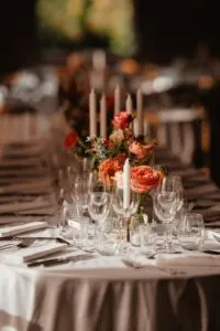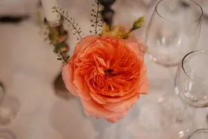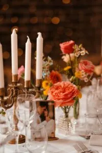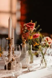 …Et de l’amour, de la complicité, de la gentillesse à l’état pur ! Avec Pauline et Emeric, tout a coulé de source. Leurs envies simples mais déterminées ont facilité les choix des objets pour la création de la déco. Bougeoirs dépareillés, carafes élégantes et des fioles fleuries, légères, mais avec des fleurs toutes plus belles les unes que les autres !