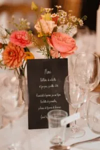 Ainsi, une décoration à leur image est née, tout simplement. Le plan de table réalisé à partir de vieux volets a conquis l’assemblée. Chacun y a trouvé facilement son nom tout en plongeant dans le thème dès sa découverte.En amont, la panneau de bienvenue, réalisé en peinture par la fée, a accueilli les invités. Ils ont de suite identifié le motif du faire-part. Enfin, pour apporter une touche très personnelle à l’ensemble, la fée a utilisé des blidas en guise de cadeau invité/porte-nom.
