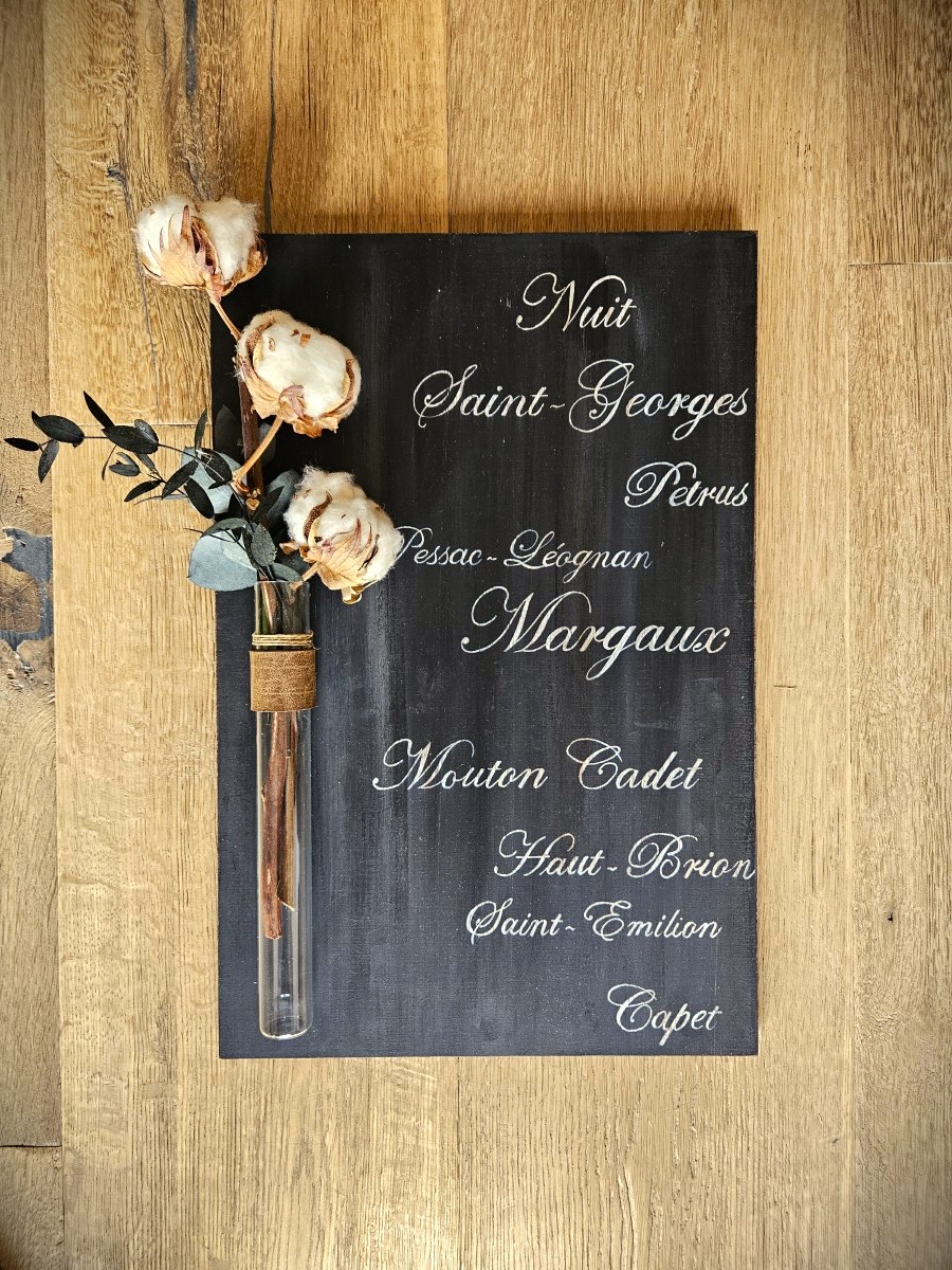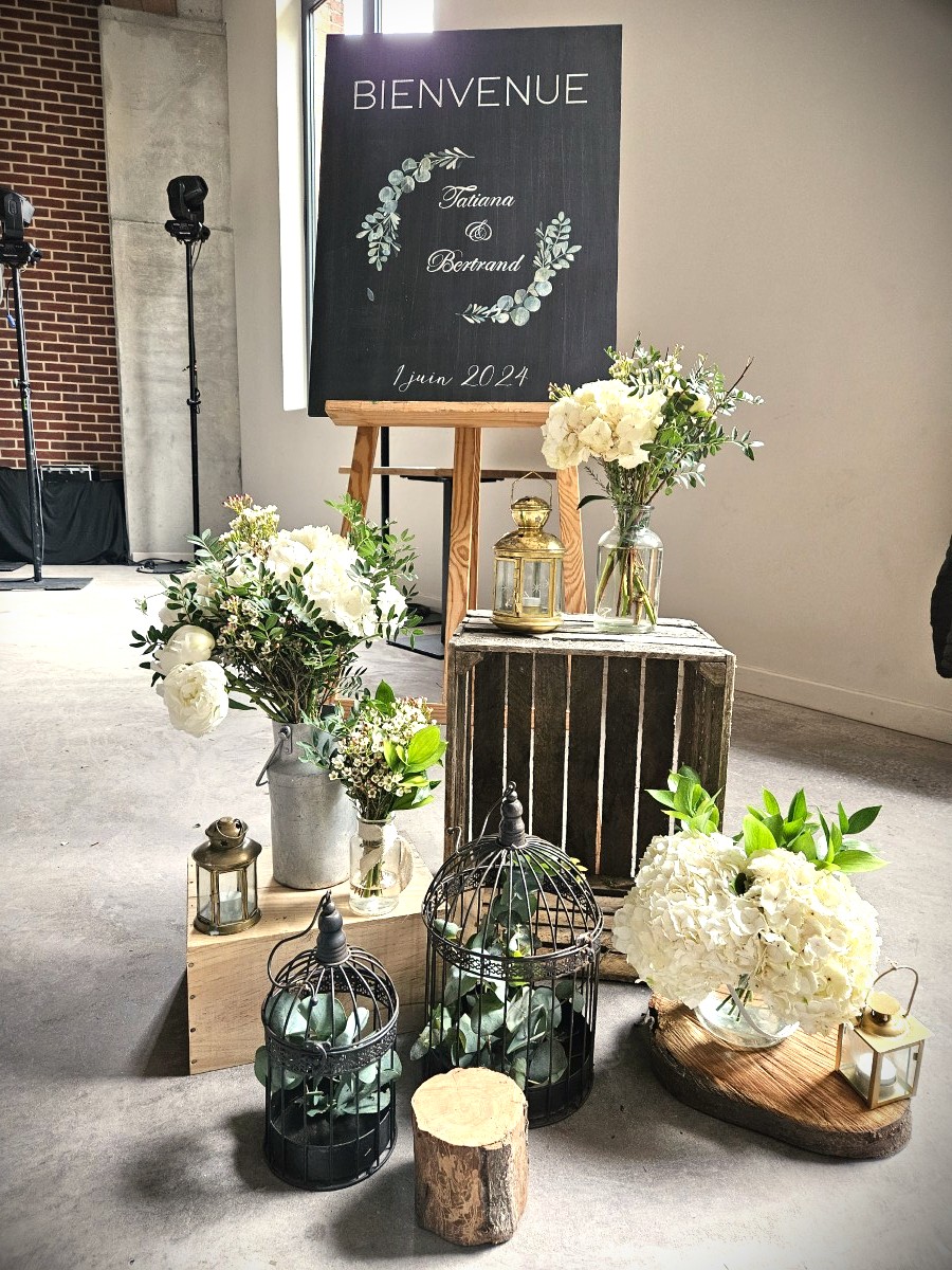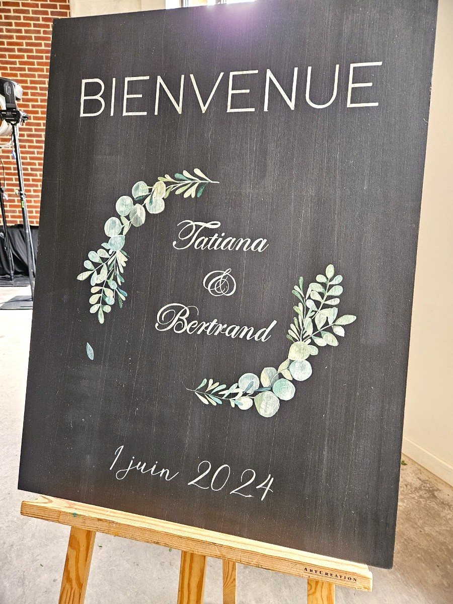Un coin photo, où les invités auraient pu s’installer pour déguster un grand cru a pris place dans la salle. Et le panneau d’accueil, leur faire-part sur fond ardoise, a souhaité la bienvenue dès le vin d’honneur aux invités.