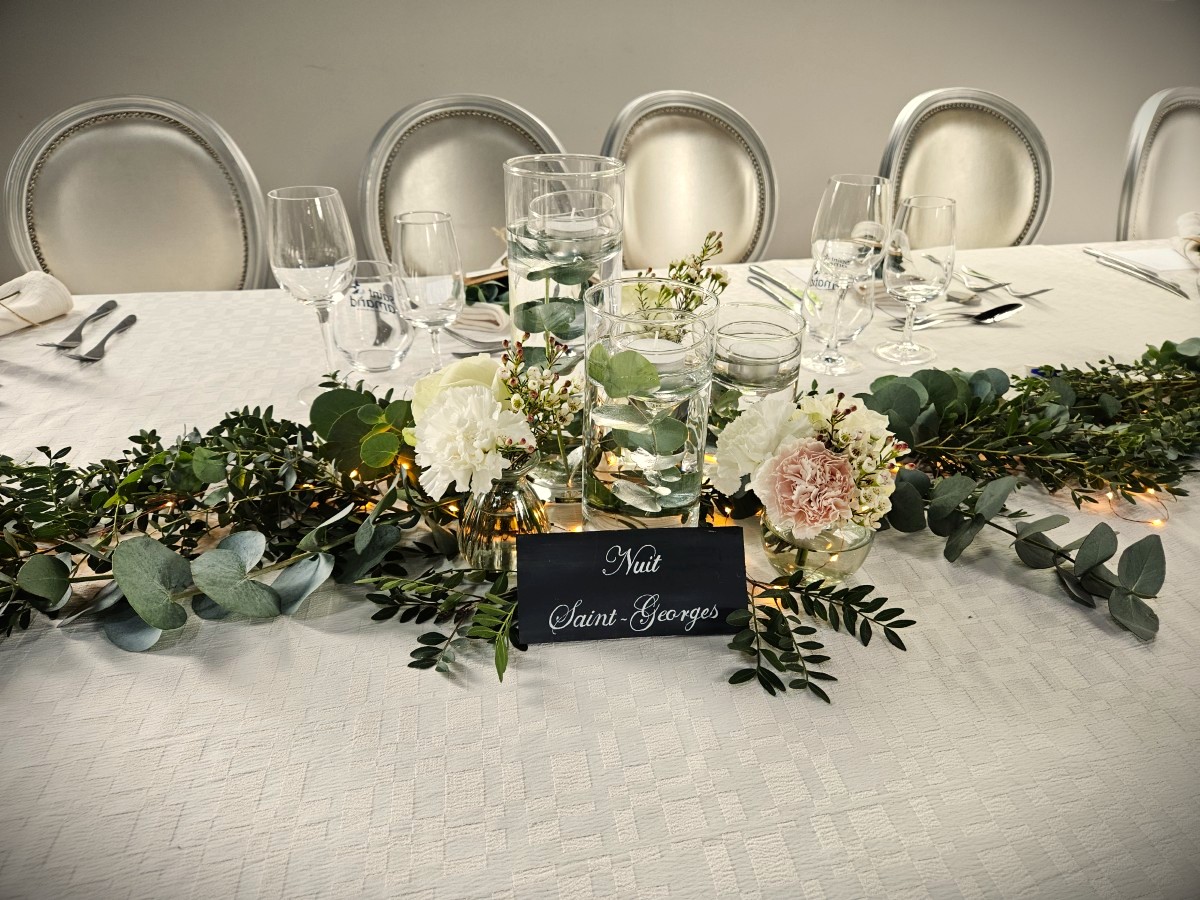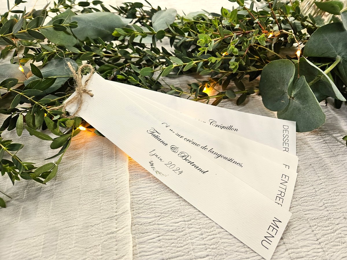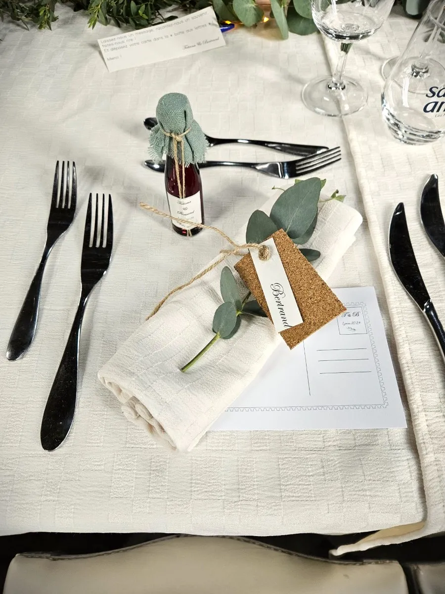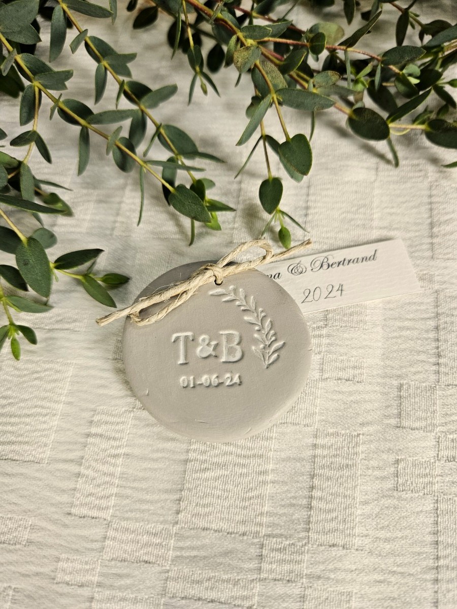 Les noms de table, noms de grands crus, apparaitraient sous forme d’ardoise. Ils ont ensuite choisi une fiole contenant un vin cuit pour les hommes. Et, pour les femmes, un magnet réalisé en argile. Sur ce dernier, la fée a gravé une couronne de laurier, rappel de leur faire-part.