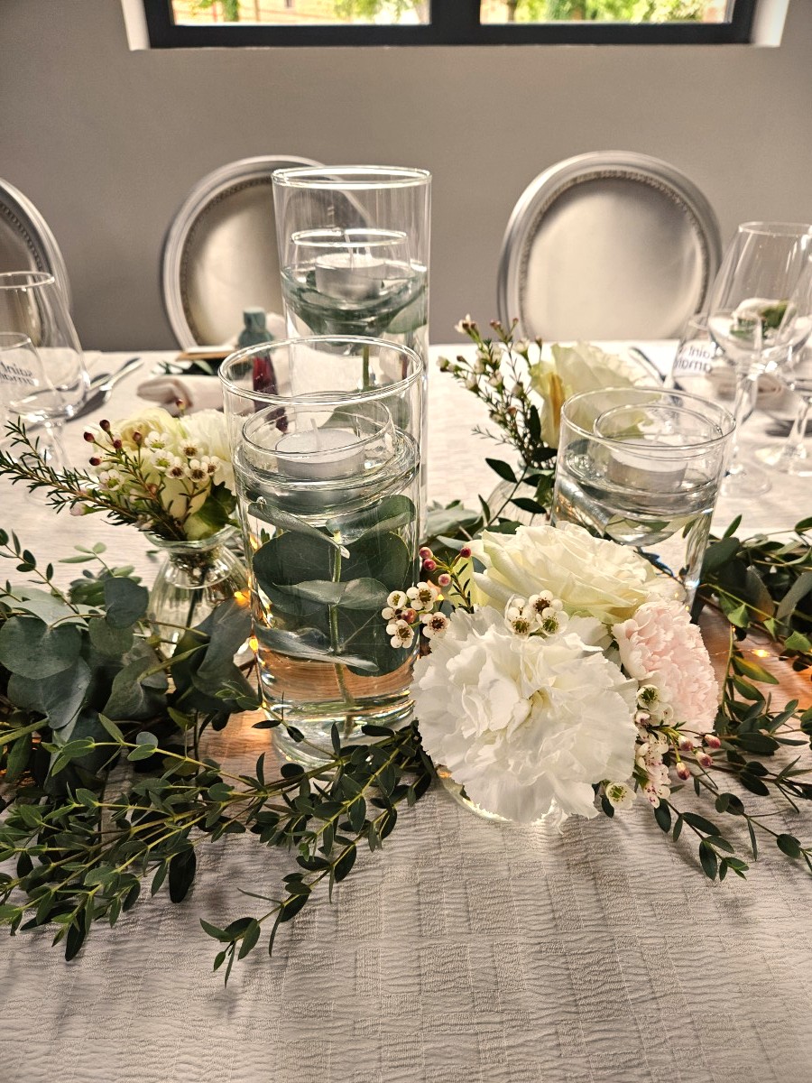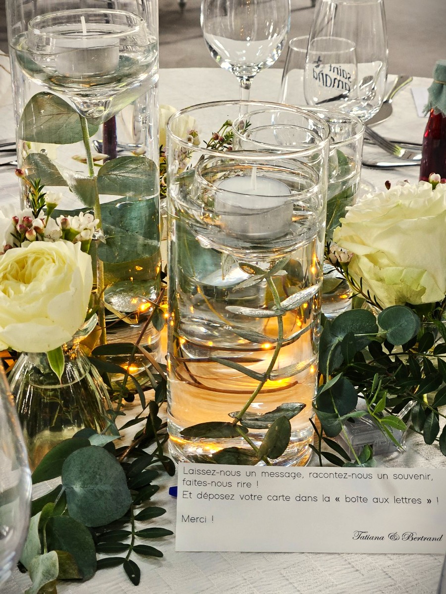 En effet, Tatiana et Bertrand souhaitaient une décoration sobre et élégante, et un clin d’oeil au vin. Une fois le centre choisi, simples vases droits avec bougies flottantes et fleurs autour, nous avons travaillé les détails.
