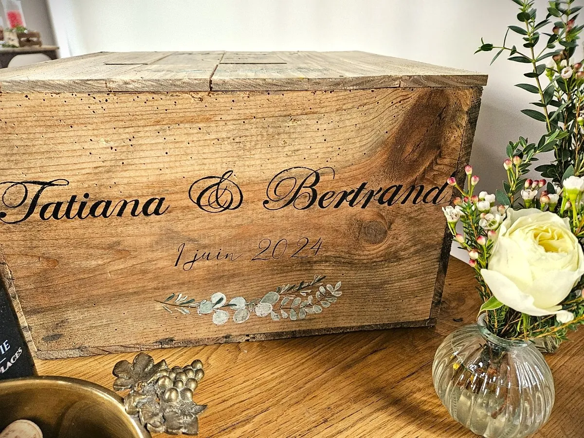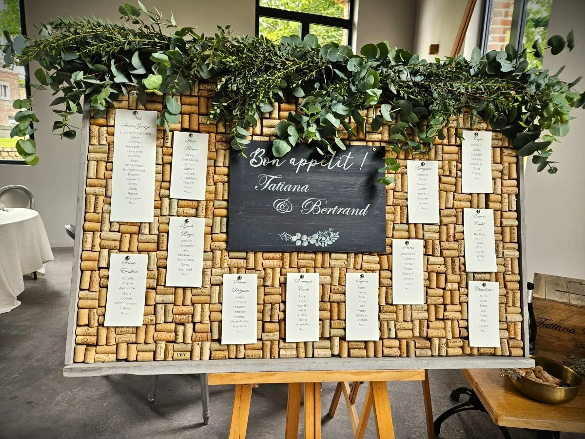 Enfin, le plan de table et la tirelire ont annoncé le thème. En effet, Tatiana et Bertrand ont choisi le panneau recouvert de bouchons de liège pour positionner les tables. Quant à la tirelire, c’est leur ancienne caisse de vin, patinée par les ans, que la fée a personnalisée.