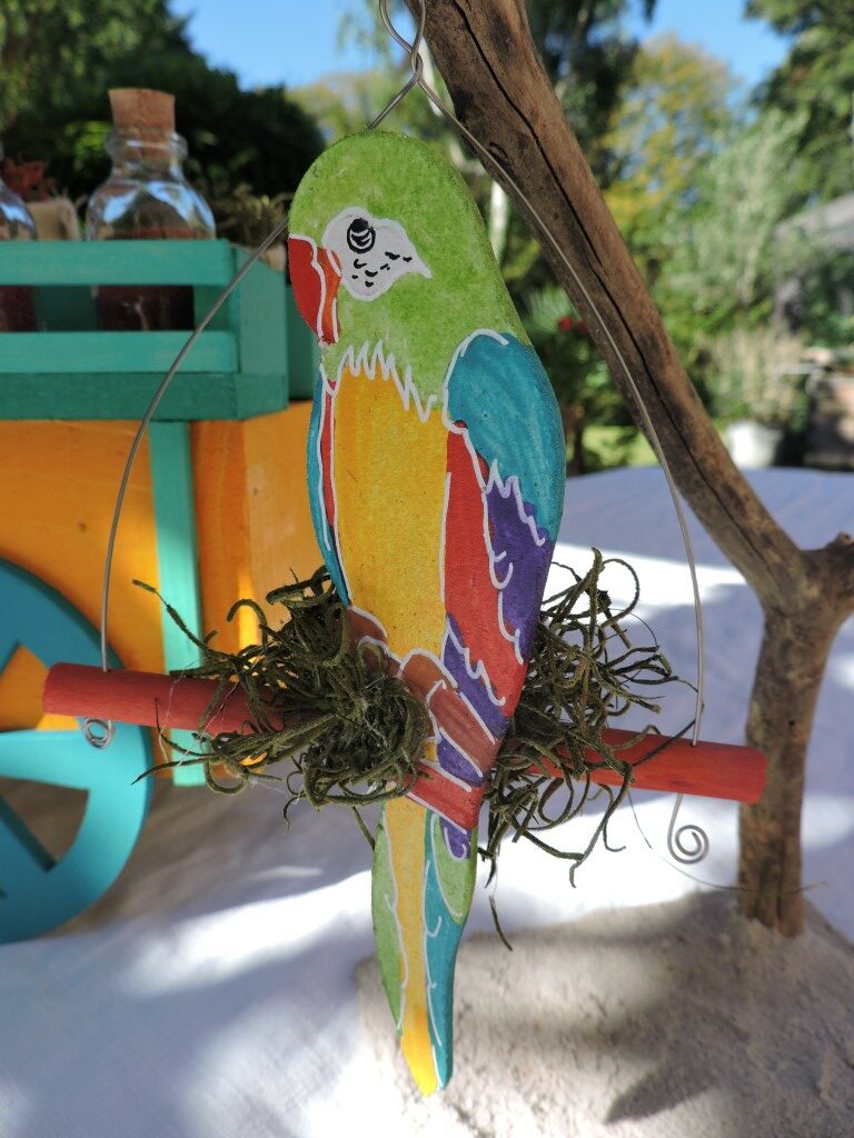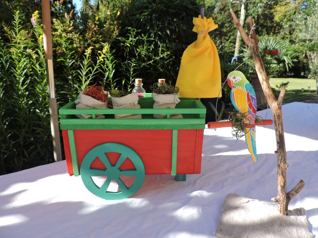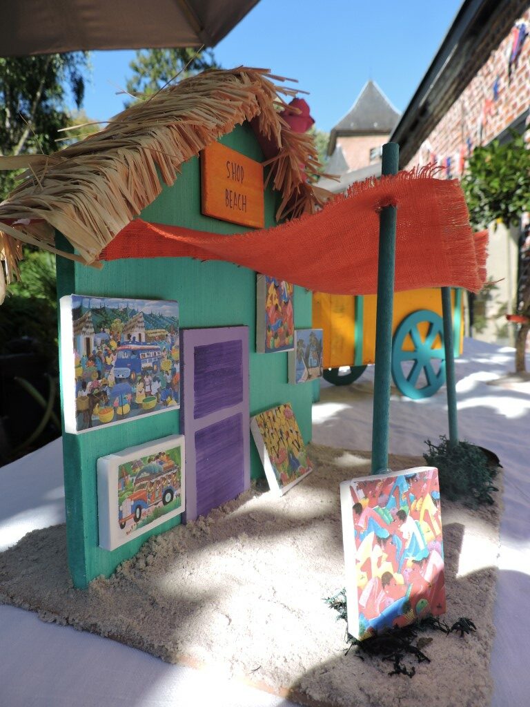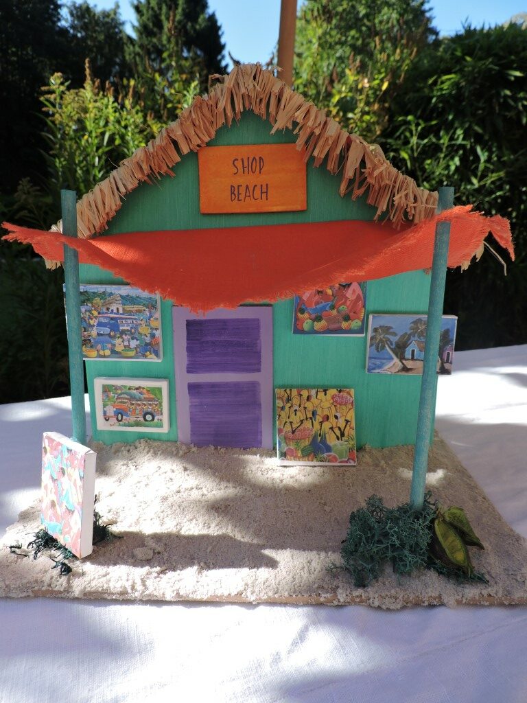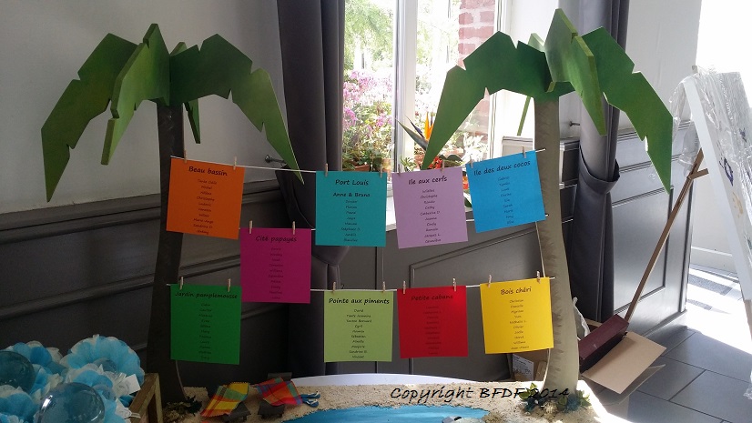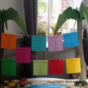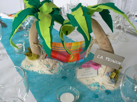 Ainsi naissent sur les centres de table des paillottes, de mini palmiers, des cahutes colorées, avec ou sans eau, selon vos envies ! Viennent s’ajouter des hamacs, des transats, des tongs….La fée agrémente tos ces éléments de tissus multicolores, madras pour les Antilles, imprimés de fleurs de tiaré pour la Polynésie…