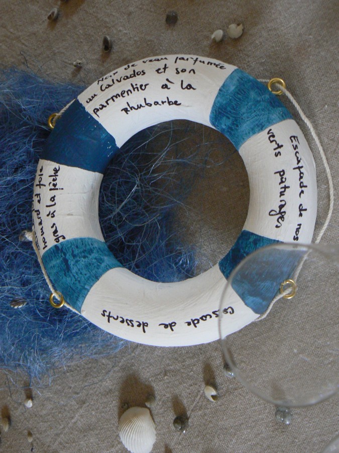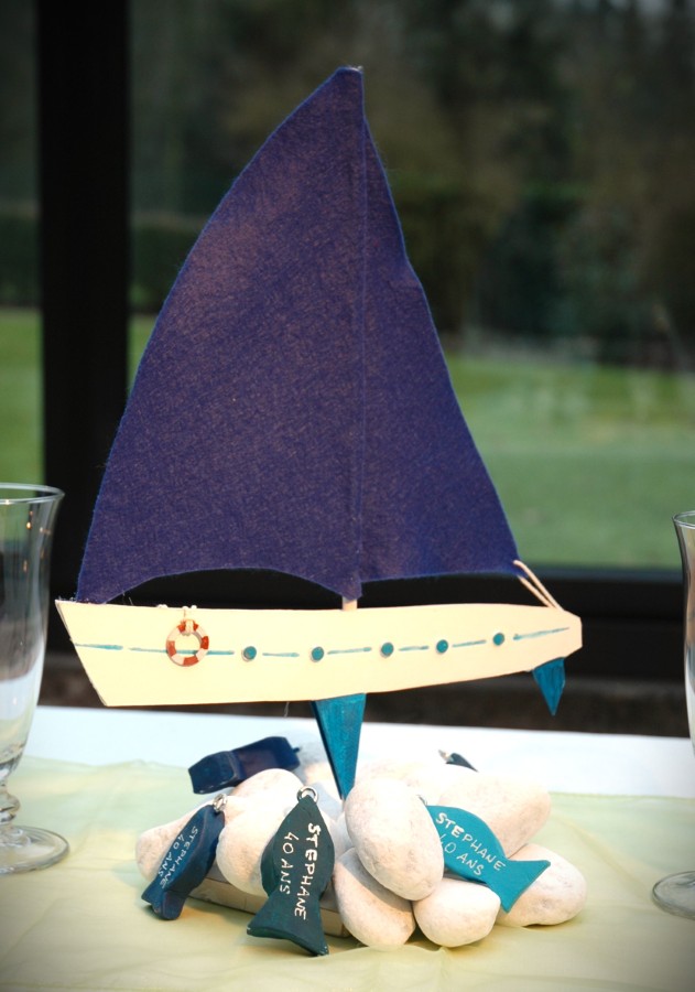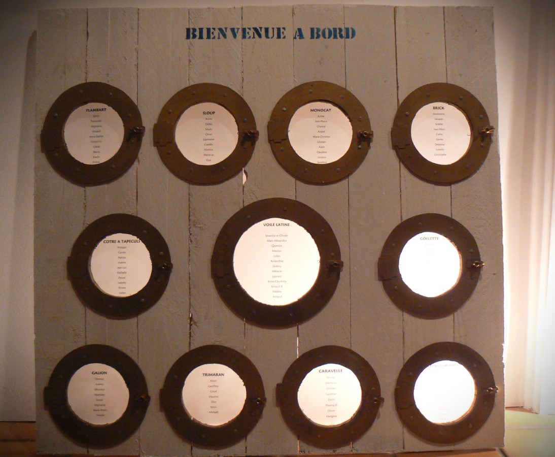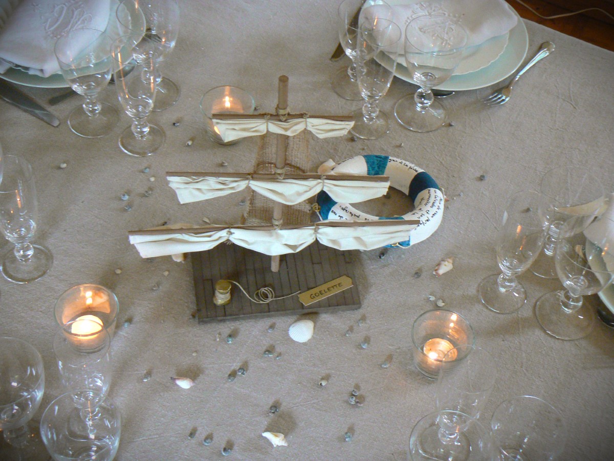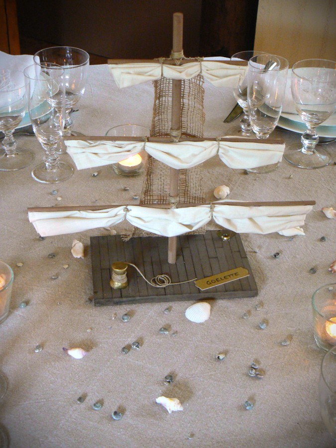 Ainsi, pour la base des centres, la fée s’est inspirée des parquets qui habillent le pont des bateaux. Elle a ensuite dressé un mat et ses voiles repliées. Afin de varier les décors, la fée a exploité l’idée du hublot. Transparence de la vitre, celui-ci s’est transformé en photophore au centre de la table. A sa base, le menu a pris place sous la forme d’une bouée ancienne aux couleurs passées.
